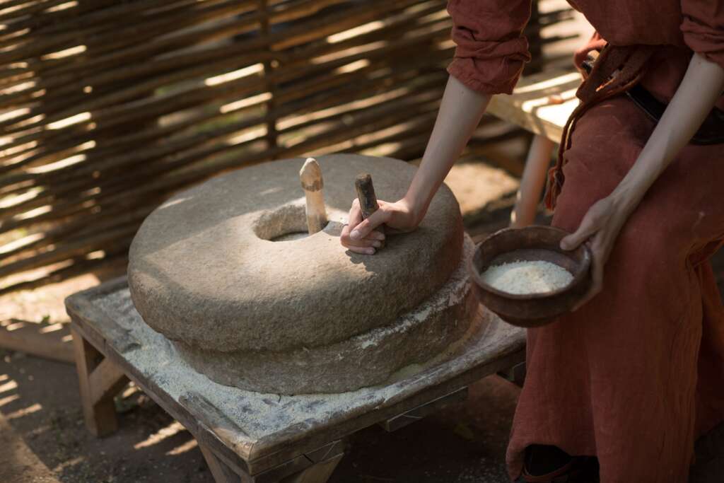Corn was also cultivated. Corn, wheat and other grains would be ground using two round stones called quern stones. The stones were made of basalt if it was available because basalt being a comparatively hard stone would be less likely to flake off into the flour. The lower, stationary stone was sometimes called the saddle quern while the upper, similarly shaped stone was the muller. The difference between the two stones was that the upper stone had a round hole cut in it in which to pour the grain. Another smaller hole might be made to more conveniently insert a stick or level to grasp in order to rotate the muller, thereby pulverizing the grain against the saddle. This took time, however, and human muscle. By sometime between 650–850), the Kilbegly Mill opened and water provided the necessary service (at a fee, of course.)